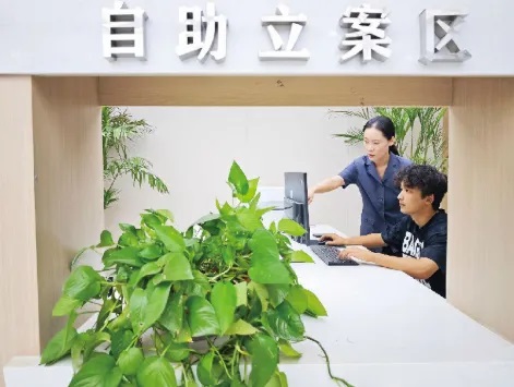 9月15日,喀什市人民法院自由貿(mào)易試驗(yàn)區(qū)喀什片區(qū)人民法庭法官(左)指導(dǎo)群眾在自助立案區(qū)填寫申請(qǐng)立案材料。石榴云/新疆法治報(bào)記者趙書城攝