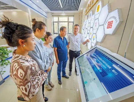 9月15日,喀什“法智谷”法律服務(wù)平臺(tái)工作人員向來訪群眾介紹平臺(tái)功能及操作流程。石榴云/新疆法治報(bào)記者趙書城攝