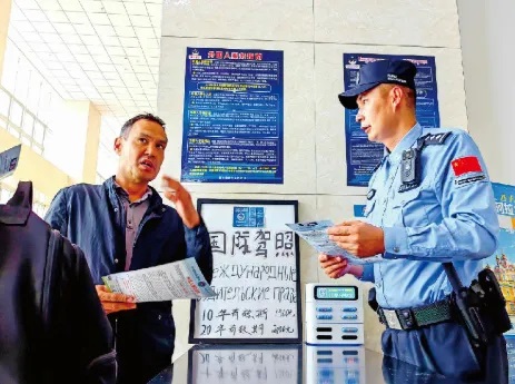 2024年9月,在霍爾果斯國(guó)際客運(yùn)站外國(guó)人管理服務(wù)站,民警向游客提供法律咨詢。石榴云/新疆法治報(bào)記者王晨攝